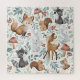 Animais florestais adoráveis como raposas, guaxinins, coelhinhos, esquilos, e um veado lúdico cercado por verde macio e cogumelos