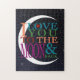 quebra-cabeça colorido com a frase, "Amo-te à lua e de volta" com as estrelas noturnas e o céu atrás de uma lua parcial. Concebido por Robin; determinados elementos através da associação com a Fábrica de Gráficos