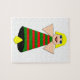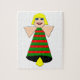 Esta quebra-cabeça espetacular apresenta um Anjo de Natal bonito com cabelo louro, olhos azuis e um sorriso grande. O corpo dela é um sino verde festivo e vermelho, com um aplauso amarelo no fundo.