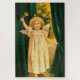 Vintage illustration of a lovely angel with white feather wings and golden hair, ringing the bell for Christmas time. On the background behind the dark green curtains is a nostalgic Christmas tree with bright burning candles.