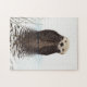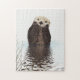 Um quebra-cabeça com uma fotografia de uma lontra fofa e adorável que se ergueu na água com as patas a segurar o rosto.