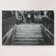 Um quebra-cabeça preto e branco contendo uma foto de um cachorro vagando em um bazar de rua em Paris perto da estação de metrô subterrânea.