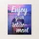Mensagem "Aproveite sua aposentadoria" sobre a foto de um barco em um lago tranquilo.