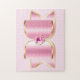 Um quebra-cabeça com um arco brilhante brilhante, com contorno de ouro e uma pedra-pomes rosa facetada no centro. Estilo de luxo feminino.