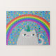 Ilustração de unicórnio fofo, rabisco, gato - em combinação com um belo arco-íris e estrelas coloridas fabulosas ao fundo.