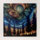 Arte mística ai com um céu azul e laranja girando com silhuetas de pinheiros.