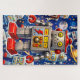 Embark on a journey through the stars with this vibrant galactic robot exploration design set against a deep shimmering nebula filled with twinkling stars and drifting golden asteroids. This artwork features a charming squad of retro style 10 robots the central character with its bold red lightning bolt and bright yellow eyes stands out in high definition detail accompanied by its mechanical companions in classic silver and Forest Green the playful sticker style white outlines around the robot robots give the piece of modern Pop art feel while the cosmic backdrop adds a sense of infinite wonder it's a perfect blend