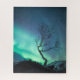 Linda luz polar verde (Aurora borealis) atrás de uma árvore na costa da Noruega Norte, Escandinávia.
