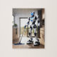 Uma ilustração realista mostrando a aplicação de um robô humanoide moderno em cenários domésticos do dia a dia. Mostre o robô executando tarefas domésticas sem problemas, como limpar o chão da cozinha com um aspirador. Enfatize a sua utilidade prática e a sua integração no ambiente doméstico. Alta resolução para realismo detalhado. Uma mistura de realismo e estética futurista para transmitir um sentido de modernidade.