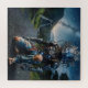 Um robô humanoide com olhos azuis luminosos ajoelha-se num caminho que leva a um templo antigo, combinando tecnologia com arquitetura histórica. O intricado design do robô e o circuito exposto contrastam de forma impressionante com o pano de fundo natural da paisagem. As estrelas da noite brilham suavemente no céu, melhorando a atmosfera mística da cena.