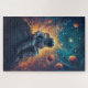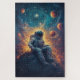 Design para entusiastas de ficção científica e exploradores espaciais! Essa design oferece uma ilustração de um astronauta solitário sentado sobre uma rocha espacial contra uma nebulosa.