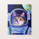 Quebra-cabeça em um astronauta gengibre giro em um traje espacial, contra o espaço exterior, com a Terra ao fundo