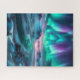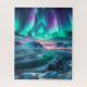 Luzes do Nordeste (Aurora Borealis) descendo do céu sobre uma paisagem nevada e um rio que leva o olho para uma cidade distante iluminam-se intensamente na noite vista por martinspixs.