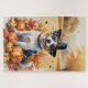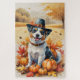 Uma pintura em forma de aquarela de um cão alegre sentado em meio a uma pilha de folhas vibrantes de queda, cercado por pequenas abóboras e bolotas espalhadas. O cachorro veste um chapéu de peregrino e fede de alegria, capturando o espírito da Ação de Graças. No fundo, campos de colheita suaves e árvores abrigadas em ouro criam um ambiente rural pacífico. Texturas gentis e tons de outono aquecidos dão à cena uma sensação acolhedora e nostálgica de celebrar a beleza da estação.