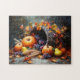 Uma pintura vibrante de uma cornucopia transbordando de abóboras, uvas, peras, trigo e folhas de outono.