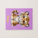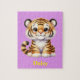 A quebra-cabeça deste miúdo com fundo roxo e um tigre bebê podem ser personalizados com o nome do vosso filho.