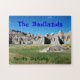 A beleza natural das terras áridas é exposta nesta foto. O Parque Nacional Badlands está localizado em Dakota do Sul e é uma maravilha geológica de erodir bordas, torres e pináculos. Bandas coloridas de estratos rochosos compõem uma visão panorâmica da paisagem robusta à medida que o sol lança sombras que enchem raízes, fissuras e fissuras. Estrias paralelas pintam a paisagem em camadas de vermelhos, castanhos, bronzeadores e cores de cinza, resultando em uma visão espetacular do recorte rochoso de rochas. O verde da pradaria mista das pradarias nacionais é visível em primeiro plano. Vestígios de nuvens brancas podem ser vistos em um céu azul claro.