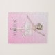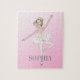 Um quebra-cabeça especial para a bailarina. O design é facilmente personalizado digitando seu próprio nome. Uma bailarina em um tutu cor-de-rosa é apresentada sobre um fundo cor-de-rosa.