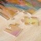 uma trabalho de arte decorativa de aquarela de um barco à vela flutuando no oceano sob um céu colorido do sol, com reflexões coloridas na água como uma quebra-cabeça de serra.