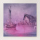 Barco chegando ao ancoradouro com pinos sutis azuis e cinzentos