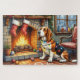 Quebra-cabeça Basset Hound Fireplace with Christmas Lights