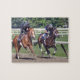 Os exercícios do amanhecer na trilha do treinamento de Oklahoma em Saratoga como estes dois puro-sangue poderosos carregam abaixo dos narizes do estiramento distante. O Jr. de Irad Ortiz do jóquei no trilho conduz este estagiário de Todd Pletcher no estiramento.