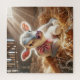 Um filhote jovem, com um arco rosa amarrado ao pescoço, põe-se num leito de palha num cano com raios solares a brilhar