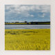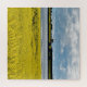 Um campo de canola amarela vibrante floresce sob um céu dinâmico, com manchas de nuvens fluffy lançando sombras na paisagem. Ao fundo, uma banda contrastante de árvores verdes escuras separa o campo de uma extensão tranquila de água. Esta imagem foi tirada perto de Streatham em Victoria, Austrália.