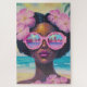 retrato espantoso e vibrante de uma na moda que veste óculos de sol cor-de-rosa sobredimensionados refletindo uma praia tropical sonhadora. Cercado por flores de hibisco macio e colocado contra um fundo oceânico turquesa, este trabalho de arte captura a essência do verão, a beleza e o empoderamento. Perfeito para amantes de praia, colecionadores de arte de moda e decor de temas tropicais.