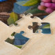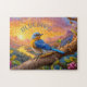 Uma bela ilustração de um pássaro azul sentado numa árvore com montanhas ao fundo durante o pôr do sol.
