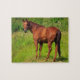Este belo quebra-cabeça de cavalo apresenta uma fotografia espantosa de um espantoso cavalo de castanha numa pastagem de primavera verde. Fotografia criada pela fotógrafa Maria Jeffs, prêmio vencedora.