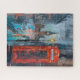 Um quebra-cabeça de paisagem urbana de Londres no estilo de expressionismo abstrato. A vista inclui uma cabine telefônica vermelha famosa e a torre de relógio Big Ben.