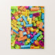 Este design apresenta uma colagem de vários blocos de construção de brinquedos plásticos neon.