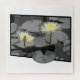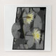 Esta imagem fora do quadro apresenta dois lírios de água delicados em matizes macios, amarelo-pálidos, destacando-se claramente contra um pano de fundo de almofadas, lírios cinza e água. As flores estendem-se para além do quadro delimitado por preto, criando um efeito dinâmico, quase tridimensional. O contraste entre os florescentes vibrantes e os subjugados arredores destaca a delicada beleza e tranquilidade da cena, evocando um senso de calma e elegância silenciosa.