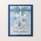 Here's a fun holiday themed jigsaw puzzle for family and friends to work on when visiting for Christmas! It features a gorgeous design of blue and silver/gray ornaments with a blue bow and artsy watercolor background, coupled with bold font that reads "Happy Holidays!". Feel free to remove and/or edit the text prior to placing into your shopping cart.