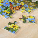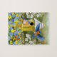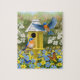 Um par de pássaros azuis orientais fazem sua casa em uma linda casa de pássaros amarelos dentro de um belo jardim de primavera cheios de margaridas azuis e amarelas e cercados por uma flor de madeira. Borboletas laranja e azul também visitam as flores.