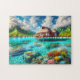 This breathtaking scene “Bora Bora Bliss: A Tropical Paradise of Crystal Waters and Dreamy Escapes” jigsaw puzzle captures the epitome of tropical luxury and tranquility, where the serene beauty of Bora Bora comes to life. The crystal-clear turquoise waters shimmer under the sunlight, revealing a vibrant coral reef teeming with color and life. The secluded overwater bungalow, with its thatched roof and private deck, offers a peaceful retreat surrounded by lush tropical flowers. In the distance, majestic green mountains rise against a backdrop of fluffy white clouds, adding a touch of grandeur to this idyllic setting. This image embodies paradise perfected, evoking dreams of relaxation, escape, and the calming embrace of nature’s finest elements.