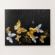 Borboletas Douradas, joias e brancas sobre fundo preto. Borboleta ouro.