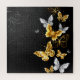 Douradas, joias e borboletas brancas sobre fundo preto. Borboleta Ouro.