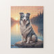 Cachorro Border Collie azul e branco sentado perto de um belo lago. Muitos desenhos de animais de estimação e paisagens em minhas lojas. Adicione este desenho a outros produtos. Adicione texto.