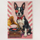 This stylish graphic poster, inspired by 1920s design, features the dapper "American Gentleman" Boston Terrier, complete with a red bow tie and a heart-shaped monocle, ready for a sophisticated Valentine's Day.