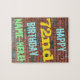 Este design de quebra-cabeça com tema de aniversário divertido apresenta uma mensagem como "FELIZ 72º ANIVERSÁRIO, NOME AQUI!", onde o nome pode ser personalizado. O fundo apresenta uma representação de uma parede de tijolos constituída por alguns tijolos de cor castanha avermelhada. O texto de mensagem personalizável apresenta cores como azul, amarelo e verde, e tem uma aparência inspirada pela do grafite pintado. Um quebra-cabeça como este pode ser usado como uma maneira divertida de enviar desejos de aniversário a alguém que comemora seus setenta e dois anos, e que talvez goste muito de fazer quebra-cabeça. [~Z0000285]