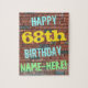 Este design de quebra-cabeça com tema de aniversário divertido apresenta uma mensagem como "FELIZ 68º ANIVERSÁRIO, NOME AQUI!", onde o nome pode ser personalizado. O fundo apresenta uma representação de uma parede de tijolos constituída por alguns tijolos de cor castanha avermelhada. O texto de mensagem personalizável apresenta cores como azul, amarelo e verde, e tem uma aparência inspirada pela do grafite pintado. Um quebra-cabeça como este pode ser usado como uma maneira divertida de enviar desejos de aniversário a alguém que comemora seus sessenta e oito anos, e que talvez goste muito de fazer quebra-cabeça. [~Z0000285]