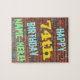 Este design de quebra-cabeça com tema de aniversário divertido apresenta uma mensagem como "FELIZ 74 ANOS, NOME AQUI!", onde o nome pode ser personalizado. O fundo apresenta uma representação de uma parede de tijolos constituída por alguns tijolos de cor castanha avermelhada. O texto de mensagem personalizável apresenta cores como azul, amarelo e verde, e tem uma aparência inspirada pela do grafite pintado. Um quebra-cabeça como este pode ser usado como uma maneira divertida de enviar desejos de aniversário a alguém que comemora seus setenta e quatro anos, e que talvez goste muito de fazer quebra-cabeça. [~Z0000285]