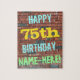 Este design de quebra-cabeça com o tema de aniversário divertido apresenta uma mensagem como "FELIZ 75º ANIVERSÁRIO, NOME AQUI!", onde o nome pode ser personalizado. O fundo apresenta uma representação de uma parede de tijolos constituída por alguns tijolos de cor castanha avermelhada. O texto de mensagem personalizável apresenta cores como azul, amarelo e verde, e tem uma aparência inspirada pela do grafite pintado. Um quebra-cabeça como este pode ser usado como uma maneira divertida de enviar desejos de aniversário a alguém que comemora seus setenta e cinco anos, e que talvez goste muito de fazer quebra-cabeça. [~Z0000285]