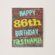 Este design de quebra-cabeça com tema de aniversário divertido apresenta uma mensagem como "FELIZ 86º ANIVERSÁRIO, NOME PRÓPRIO!", onde o nome pode ser personalizado. O fundo apresenta uma representação de uma parede de tijolos constituída por alguns tijolos de cor castanha avermelhada. O texto de mensagem personalizável apresenta cores como azul, amarelo e verde, e tem uma aparência inspirada pela do grafite pintado. Um quebra-cabeça como este pode ser usado como uma maneira divertida de enviar desejos de aniversário a alguém que comemora seus oitenta e seis anos, e que talvez realmente goste de fazer quebra-cabeça. [~Z0000285]