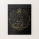 Design Buddha Mandala apresentando uma ilustração de um buda em forma de mandala em linhas cintilantes de ouro.