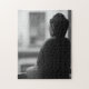 Nossa própria foto em preto e branco de uma estátua Buda sentada na posição de lótus meditando enquanto ele olha pela janela. Excelente para cartões de visitas de bem-estar ou presentes para o budista.