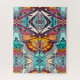 Quebra-cabeça em um padrão batik digital de uma borboleta grande sobre um fundo ornamentado, medalhão arabesco, em tons de âmbar, laranja, aqua e bege