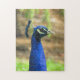 Retrato Peacock. Linda cabeça e pescoço azul. Máscara branca ao redor do olho. Tufões azuis sobre penas da coroa.